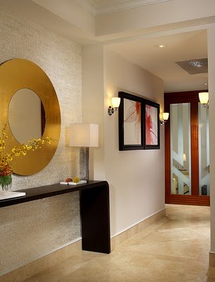 Ezen a képen a hatalmas, kerek tükör tetszik, a kecses konzolasztallal, nagyon jól mutatnak együtt.